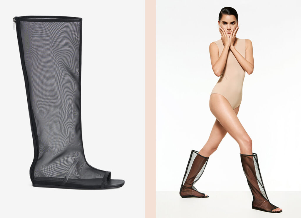 I modelli più audaci giocano con la trasparenza: la sneaker bianca see-through, lo stivale-sandalo nero ultra-flat a punta aperta e gli over-the-knee effetto seconda pelle con tacco affusolato da 9 cm, nelle tonalità cipria e polvere, portano un tocco contemporaneo e grafico.