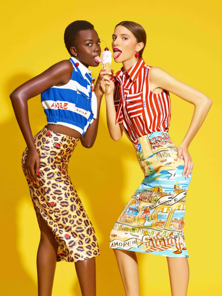 Ritorna così un leopardo “democratico e senza tempo”, come lo definiva Hilary Alexander, contaminato da stampe di baci e fragole, in stile Enriquez. La collezione è “multigusto”: fragola, banana, cioccolato, limone, pistacchio. Ogni sapore diventa un linguaggio e un’occasione per esplorare silhouette e materiali diversi. Così il denim dall’allure anni ’80, arricchito da metallerie dorate e tagli sperimentali, dialoga con abiti chemisier dal tocco disinvolto e con gonne a ruota in duchesse brillante. Le camicie over in popeline si alternano alle t-shirt ricamate con il mantra amore amore amore. Tra i pezzi chiave spiccano l’abito lungo a pois, che riprende in chiave contemporanea il segno distintivo della Signora, e la gonna a righe, che rievoca le atmosfere da dolce vita in riviera. La proposta cocktail in taffetà nero con rosa bianca, dal carattere romantico, si alterna a maxi gonne a trapezio con maxi gelati disegnati, che introducono una nota ironica e immediatamente riconoscibile. Il guardaroba Enriquez si completa con minidress a fragole all over, completi sartoriali a righe multicolor e top con ruches floreali, che sottolineano l’anima giocosa della collezione. Qui il contributo di Jardini emerge con forza: i pois diventano micro e maxi, si intrecciano alle righe degli ombrelloni e ai pattern estivi.