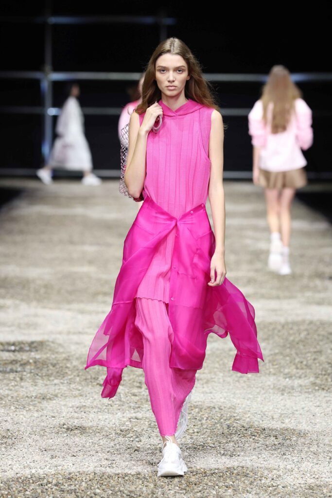 I colori, vivaci e intensi, incarnano uno spirito di ottimismo: dal blu, verde, giallo e rosa, fino ai pastello come avorio, menta e pesca, sfumature glicine, lilla e viola. L’arancio, richiamo all’intervento umano e alla ricostruzione, emerge sui caschi scultorei. Le texture non convenzionali — fili riciclati, filati metallici, tessuti traslucidi — riflettono il linguaggio tattile di Iwasaki. L’impegno sostenibile è evidente nell’uso di fibre riciclate, nylon rigenerato, poliestere e nelle collaborazioni con artigiani che applicano tecniche zero waste, mostrando la bellezza di un rinnovamento consapevole. La collezione spazia dal cappotto con dettaglio trompe-l’œil, al trench corto rivisitato, fino al bermuda unisex in cotone da trench. Un’opera di Iwasaki diventa stampa su maglia mesh traspirante, mentre polo e gonna in maglia richiamano le reti da costruzione industriale, trasformando il quotidiano in arte da indossare.