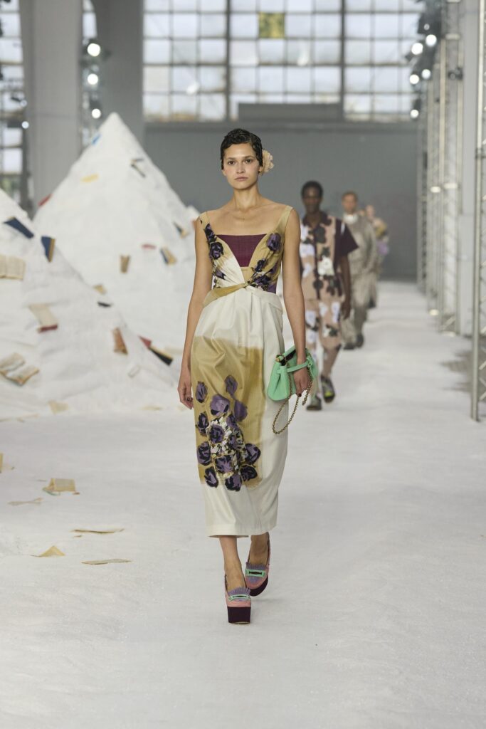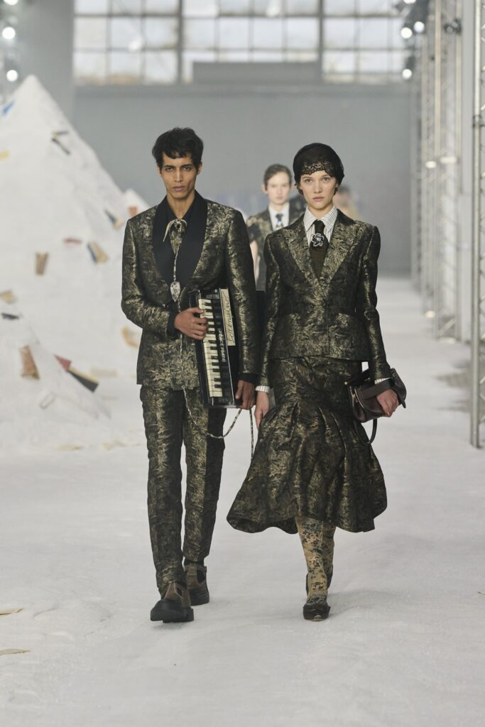 In passerella si alternano vestaglie degne di dive hollywoodiane e capi maschili dal taglio sartoriale, tailleur e abiti da soirée, caban oversize e giacchine sagomate. Non mancano completi pigiama, maglieria che sembra ricamo, denim accostato a tessuti preziosi.
