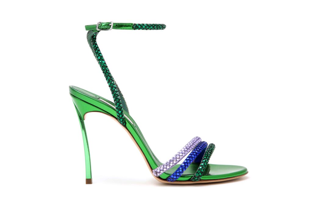 Il cuore della collezione è il Blade, il tacco architettonico firmato Casadei, che per la primavera/estate 2026 torna in radiose tonalità metalliche e solari. Il nuovo Blade Victory sfoggia un’audace T bar doppia, in versione aperta e chiusa. Superblade Sharp, che ha debuttato al Festival di Cannes, è il simbolo dell’eleganza da red carpet. Una scarpa super appuntita con scollo a sabot e cinturino sottilissimo alla caviglia, per una sofisticata provocazione. Belle Epoque è il tacco gioiello per antonomasia, circondato da coloratissimi cristalli portafortuna che aggiungono un tocco d’incanto al proprio look, con eleganza e raffinatezza. Rappresenta un delicato richiamo all’intimità del design, al potere della tradizione e alla lavorazione meticolosa, sinonimo di Casadei. Il sandalo Julia, con un incrocio ad otto capi che crea un intrigante criss cross, rivela figure simbolo di amore e tradizione.