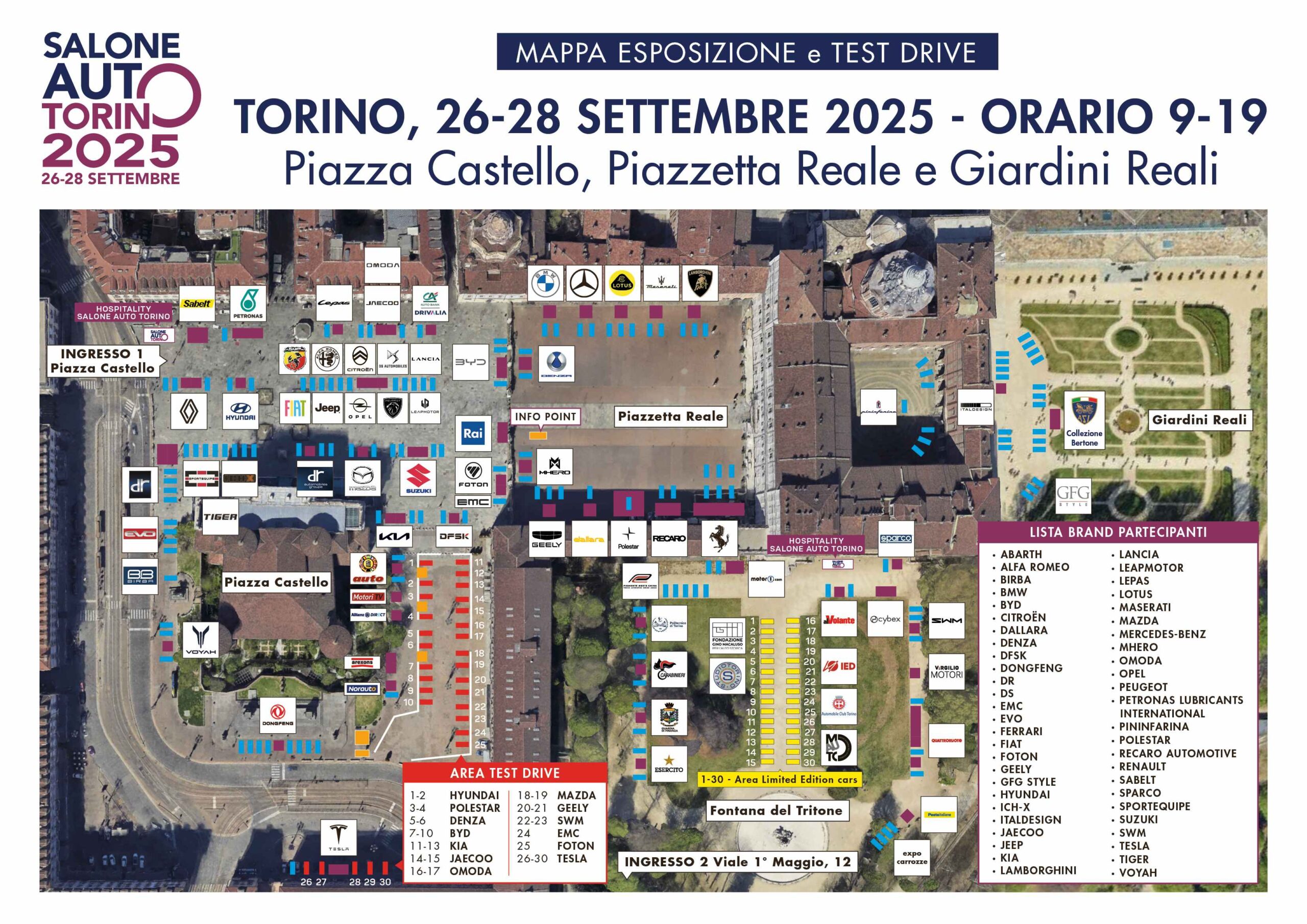 È stata rilasciata la mappa di Salone Auto Torino 2025, con il posizionamento dei 50 brand automotive: Abarth, Alfa Romeo, Birba, BMW, BYD, Citroën, Dallara, DENZA, DFSK, Dongfeng, DR, DS, EMC, Evo, Ferrari, Foton, Geely, GFG Style, Hyundai, ICH-X, Italdesign, Jaecoo, Jeep, KIA, Lamborghini, Lancia, Leapmotor, Lepas, Lotus, Fiat, Maserati, Mazda, Mercedes-Benz, MHero, Omoda, Opel, […]