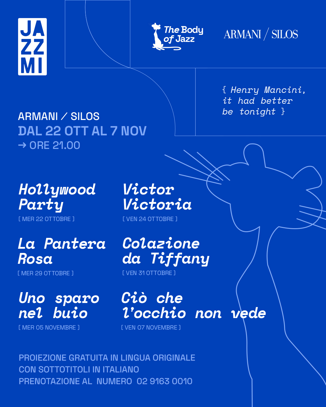 In occasione di JAZZMI 2025, Armani/Silos presenta la quinta edizione della rassegna cinematografica The Body of Jazz, quest’anno dedicata a Henry Mancini, celebre compositore e figura di riferimento del panorama musicale del Novecento. Autore di alcune delle colonne sonore più eleganti e inconfondibili della storia del cinema, Mancini ha ispirato e influenzato numerosi grandi artisti del […]
