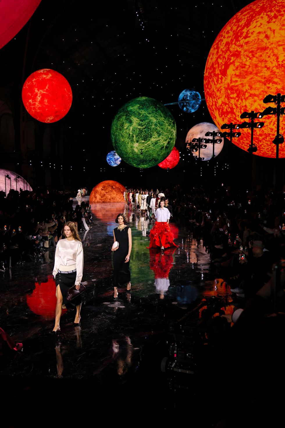 La scenografia era spettacolare: un ambiente sospeso tra spazio e sogno, con globi luminosi e riflessi che ricordavano un paesaggio extraterrestre. Su questa passerella cosmica, Blazy ha presentato un guardaroba che reinterpreta i simboli della maison con leggerezza e modernità. Un firmamento che ha incantato ed ha fatto dialogare il passato con il futuro.