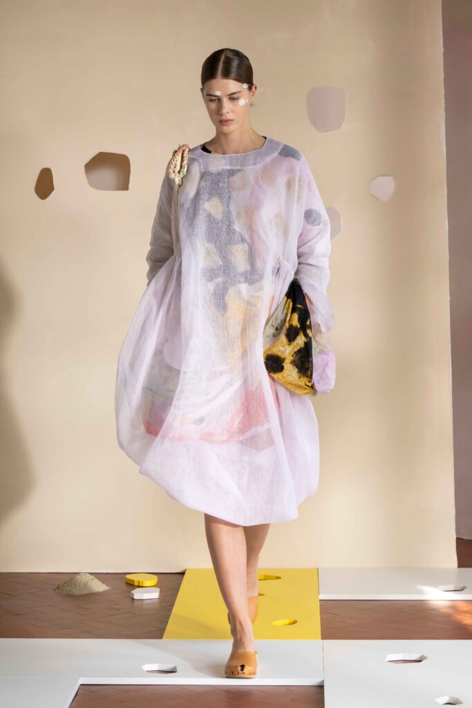 Daniela Gregis presenta la collezione Primavera/Estate 2026. Daniela Gregis scrive, disegna, scarabocchia e telefona. Le sue idee nascono dalle conversazioni e dalle relazioni con amici, parenti e sconosciuti che danno forma a creazioni, creature sempre nuove e diverse. Un tocco di rosa si fa strada lungo la collezione, la vita che si intravede nella nebbia, la felicità che illumina e il sole che scalda, rigenera, cresce, sboccia e dà frutto, giocando e creando.