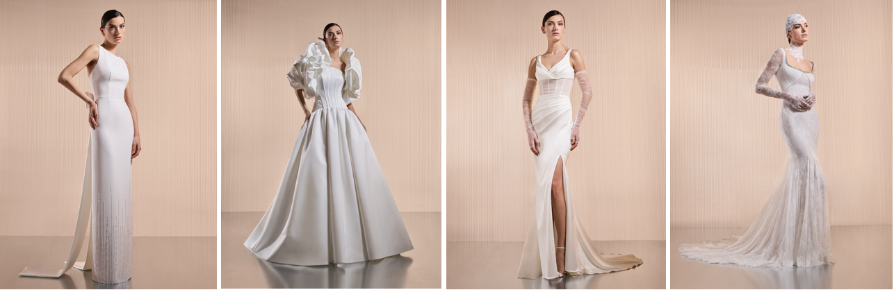 Dopo il successo della prima collaborazione nel 2024, questa seconda edizione include 18 nuovi modelli concepiti come opere scultoree che fondono arte e moda. Tessuti fluidi come il satin e il crêpe si intrecciano con tulle plissettato che evoca movimento e leggerezza, mentre le silhouette strutturate aggiungono un tocco di sensualità. La collezione gioca con il concetto di “design fluido”: drappeggi che sfidano la gravità, corsetti aderenti che scolpiscono il corpo e pizzi tridimensionali che si allontanano dallo stile tradizionale per abbracciare un’estetica più audace. L’organza si presenta con una texture rigida e luminosa, mentre i ricami in microcristalli definiscono le silhouette con linee precise e strutturate.