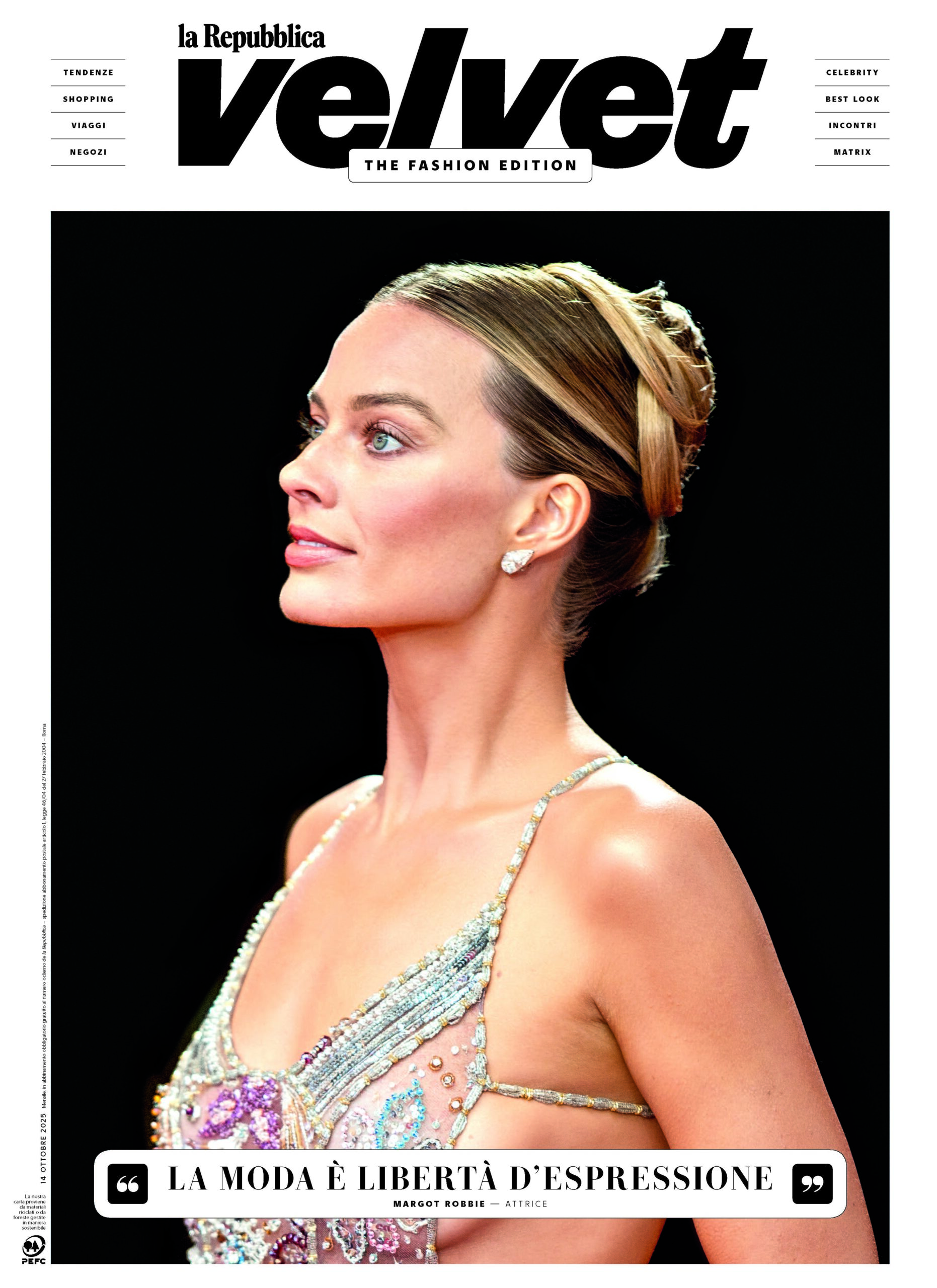 Shopping, tendenze, viaggi e non solo: da martedì 14 ottobre arriva in edicola e online Repubblica Velvet, il nuovo inserto speciale del quotidiano La Repubblica dedicato al racconto della moda e del lifestyle.“Il nome è l’omaggio a un giornale magnifico che questa casa editrice ha pubblicato tra il 2006 e il 2012” spiega il direttore Emanuele Farneti, “La forma è quella di un quotidiano, ma stampato su una carta un po’ speciale. Il progetto grafico è tutto nuovo, così come il logo. I contenuti, poi, sono pensati per aggiungere un tassello al ricco sistema editoriale con cui questo gruppo già racconta ogni giorno la moda.”Repubblica Velvet arricchisce quindi l’ecosistema composto da d – con il successo del nuovo sito lanciato a maggio – door e U, guidati dallo stesso Farneti. La struttura del nuovo inserto si comporrà di interviste e gallery fotografiche, consigli e indirizzi su luoghi da scoprire, novità, look e tendenze di stagione, piccole curiosità e approfondimenti sul mondo della moda. Il primo numero, dalla foliazione di 56 pagine, vede in copertina l’intervista esclusiva all’attrice Margot Robbie che dichiara: «La moda è libertà d’espressione». Le successive uscite, previste con una cadenza di quattro numeri ogni semestre, avranno un focus su temi quali beauty, gioielli e orologi.