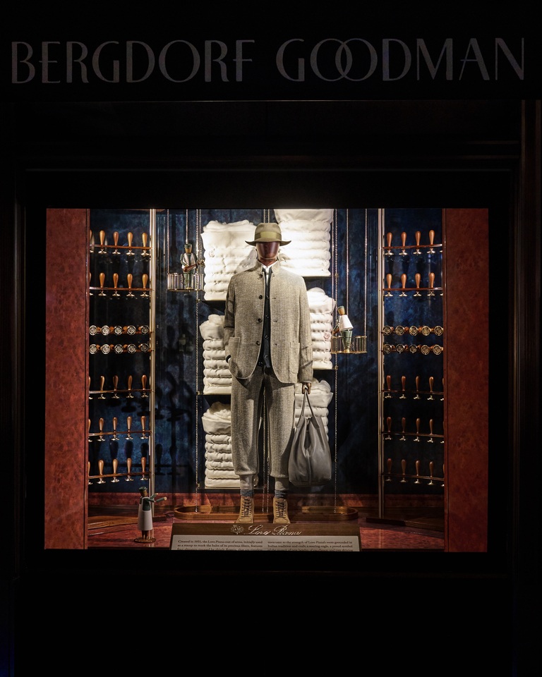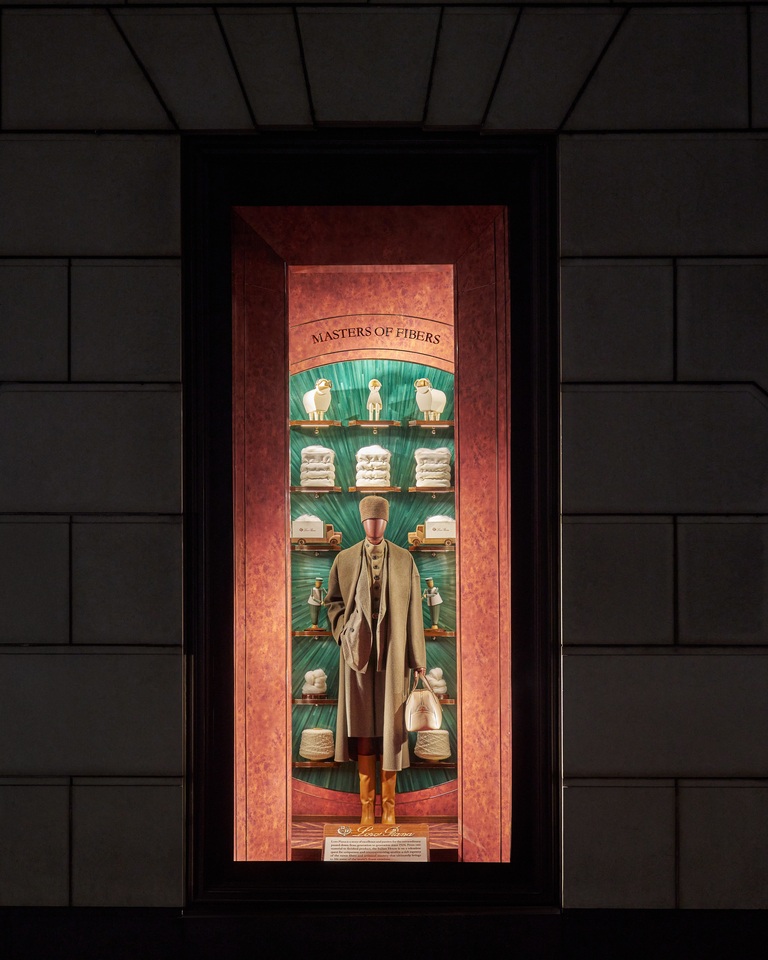 La visione di Loro Piana di esporre i tessuti nelle vetrine del loro primo concept store a New York, invece di conservarli all’interno, è celebrata nell’ultima vetrina, dove una collezione di rotoli di tessuto è impilata orizzontalmente su uno sfondo kummel, nello stile di una tradizionale esposizione da negozio.