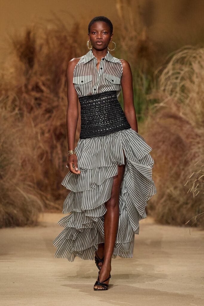La palette cromatica spazia dal corallo al limone, dal rosa al pervinca, fino a cacao e bronzo, con contrasti grafici in bianco e nero. Maglieria e stampe — righe marinière anni ’60 e fiori rivisitati — completano un guardaroba che respira con chi lo indossa.