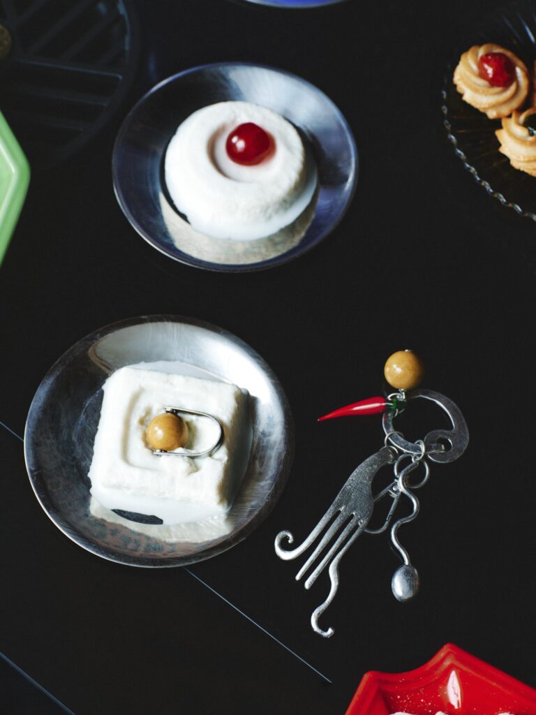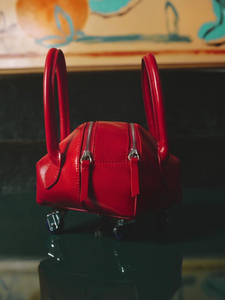 Mini dress con bottoni oversize, giacche in pelle dal carattere giocoso, borse color block e Mary Jane in rosso, oro e blu navy – tutte ispirate allo spirito degli anni Sessanta e reinterpretate attraverso lo sguardo espressivo di Vicky. I gioielli rubano la scena, trasformando cucchiai e forchette in pezzi scultorei, ironici, sorprendenti e pieni di charme.