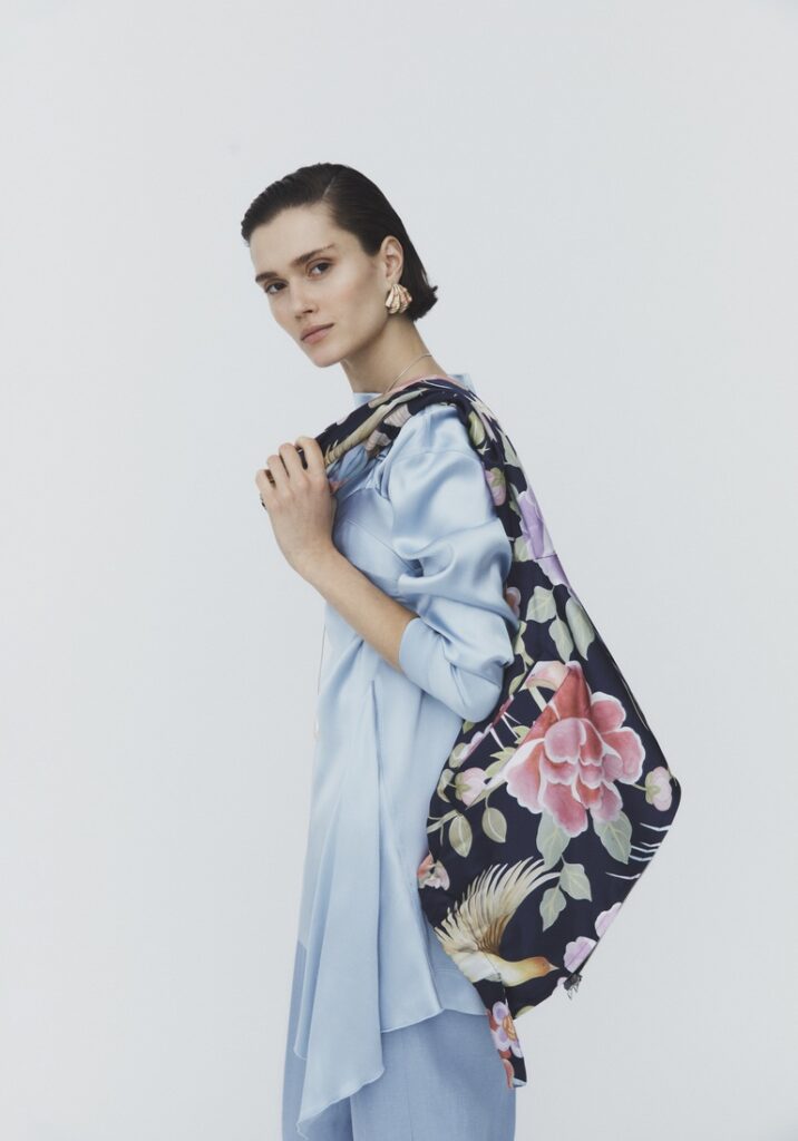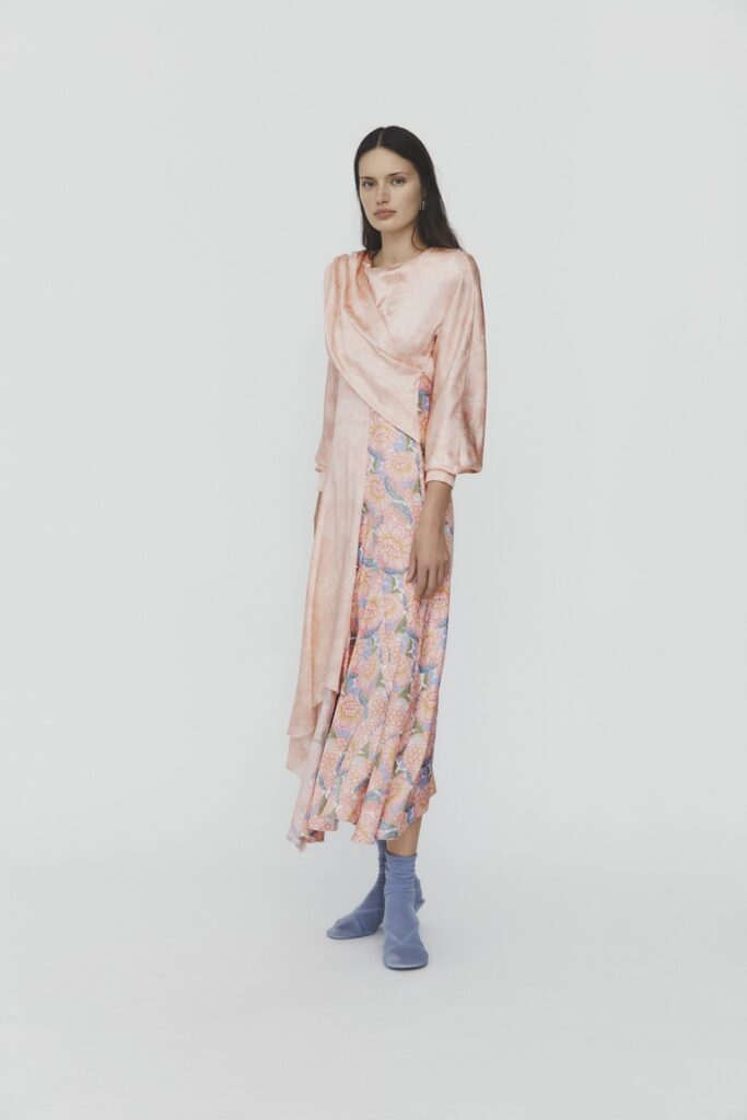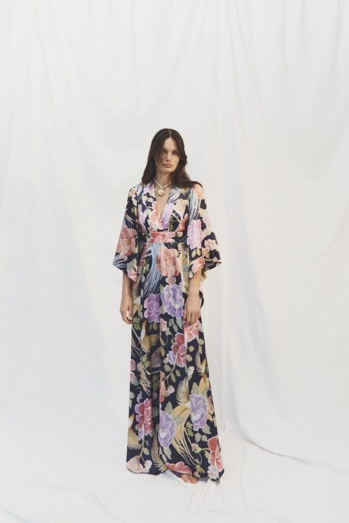 Un ruolo centrale lo giocano le stampe Liberty, reinterpretate su abiti voluminosi dalle costruzioni geometriche in georgette, seta e cotone. Le spalle raglan, esaltate da spalline ampie, donano un tocco contemporaneo che rinnova la grazia senza tempo dello stile provenzale.