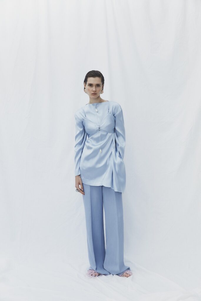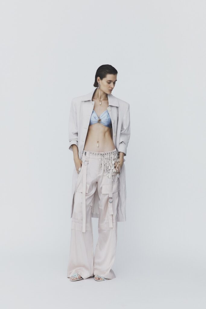 La donna Seafarer immaginata da Mariotti è eclettica e contemporanea: capace di unire eleganza e attitudine sportiva, femminilità e dettagli androgini, in un equilibrio spontaneo e armonioso. I materiali diventano il cuore della narrazione: sete fluide, lini leggeri e cotoni strutturati danno forma a volumi morbidi e precisi.