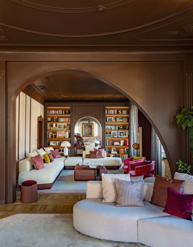 Nel living convivono i divani Astract di Leonardo Talarico, il maestoso Godwin di Carlo Colombo, le poltrone Fence di Matteo Agati e i pouf Hug di Silvio Pompei, disposti come accenti di morbidezza e comfort. Nel bow window che ospita la zona dining, protagonista è il tavolo Andrej di Elisa Ossino, laccato ruby, attorno al quale si dispongono le sedie Nebulina di Francesca Lanzavecchia, in un gioco di armonie visive e tattili.