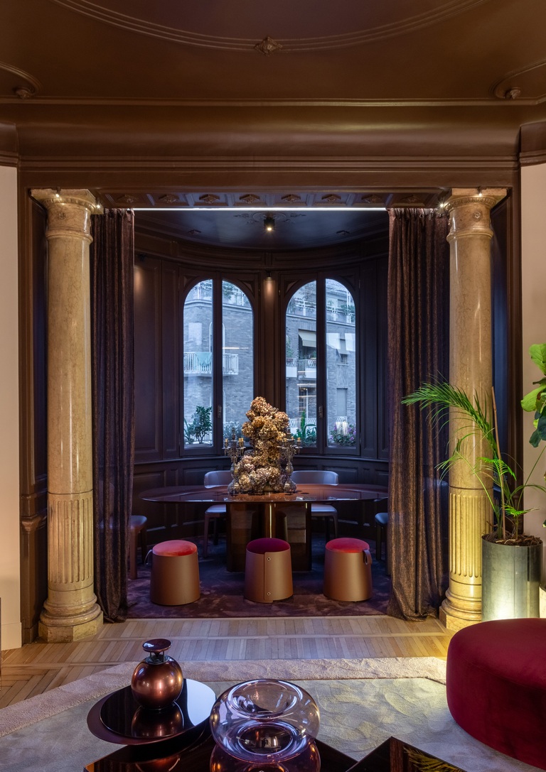 Il concept estetico si definisce in una palette calda e naturale, dominata da un sorprendente laccato color “ruby”, che trasforma gli spazi evocando una Milano colta e sensuale. La luce si fa colore, la materia diventa atmosfera.