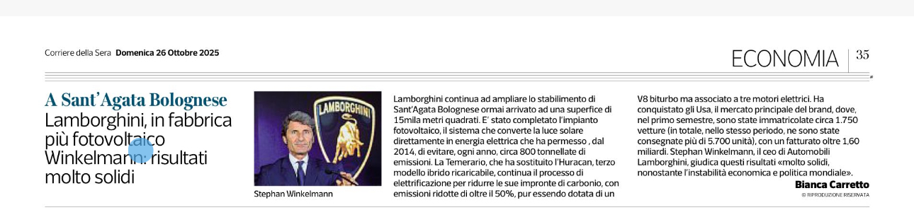 Lamborghini continua ad ampliare lo stabilimento di Sant’Agata Bolognese ormai arrivato ad una superfice di 15mila metri quadrati. E’ stato completato l’impianto fotovoltaico, il sistema che converte la luce solare direttamente in energia elettrica che ha permesso , dal 2014, di evitare, ogni anno, circa 800 tonnellate di emissioni. La Temerario, che ha sostituito l’Huracan, terzo modello ibrido ricaricabile, continua il processo di elettrificazione per ridurre le sue impronte di carbonio, con emissioni ridotte di oltre il 50%, pur essendo dotata di un V8 biturbo ma associato a tre motori elettrici. Ha conquistato gli Usa, il mercato principale del brand, dove, nel primo semestre, sono state immatricolate circa 1.750 vetture (in totale, nello stesso periodo, ne sono state consegnate più di 5.700 unità), con un fatturato oltre 1,60 miliardi. Stephan Winkelmann, il ceo di Automobili Lamborghini, giudica questi risultati «molto solidi, nonostante l’instabilità economica e politica mondiale».