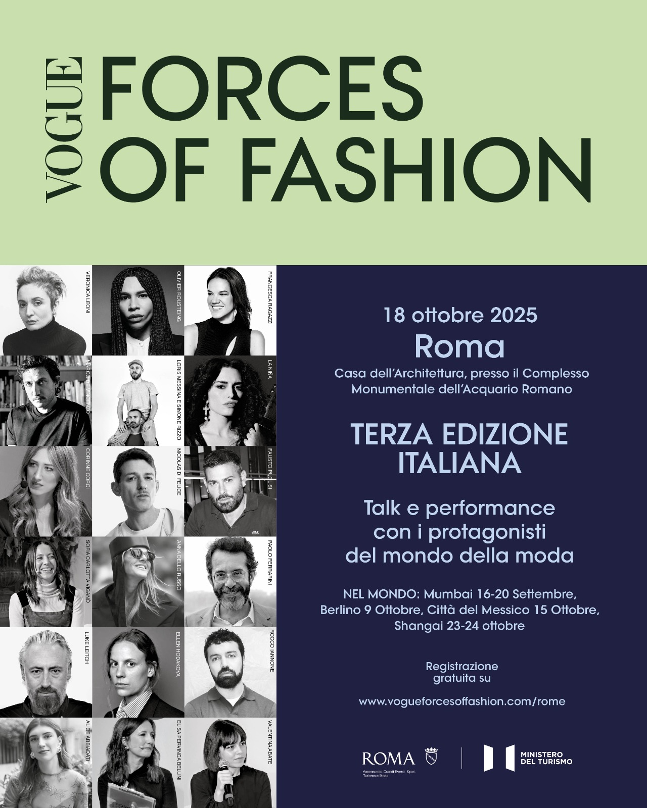 «Insieme a Vogue Italia, che ringrazio per la collaborazione, vogliamo continuare a stupire dopo il successo delle due passate edizioni. Quest’anno saremo alla Casa dell’Architettura all’Acquario Romano, in zona Esquilino, un posto unico dove architettura, storia e natura si intrecciano. Qui centinaia di studenti potranno gratuitamente conoscersi, confrontarsi, divertirsi e soprattutto ascoltare e incontrare i protagonisti più importanti della moda. L’evento sarà trasmesso anche in streaming e ci sarà anche la possibilità di effettuare gratuitamente visite guidate sull’itinerario turistico Esquilino che abbiamo promosso con il progetto ‘Unexpected Itineraries ‘. Siamo orgogliosi perché Forces Of Fashion rientra nella nostra strategia di valorizzare la moda, i giovani, e soprattutto di costruire un ponte tra professionisti del settore e i migliaia di studenti e appassionati che sognano un futuro nella moda grazie al coinvolgimento delle accademie e gli istituti della città», aggiunge Alessandro Onorato, Assessore ai Grandi Eventi, Moda, Turismo e Sport di Roma Capitale.